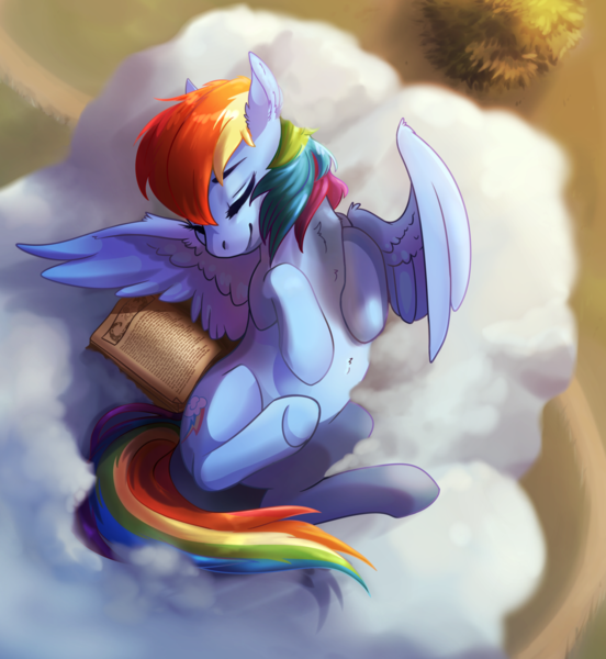 artist:csox, belly, book, cloud, cute, dashabetes, female, mare, pegasus, pony, rainbow dash, safe, sleeping, smiling, solo