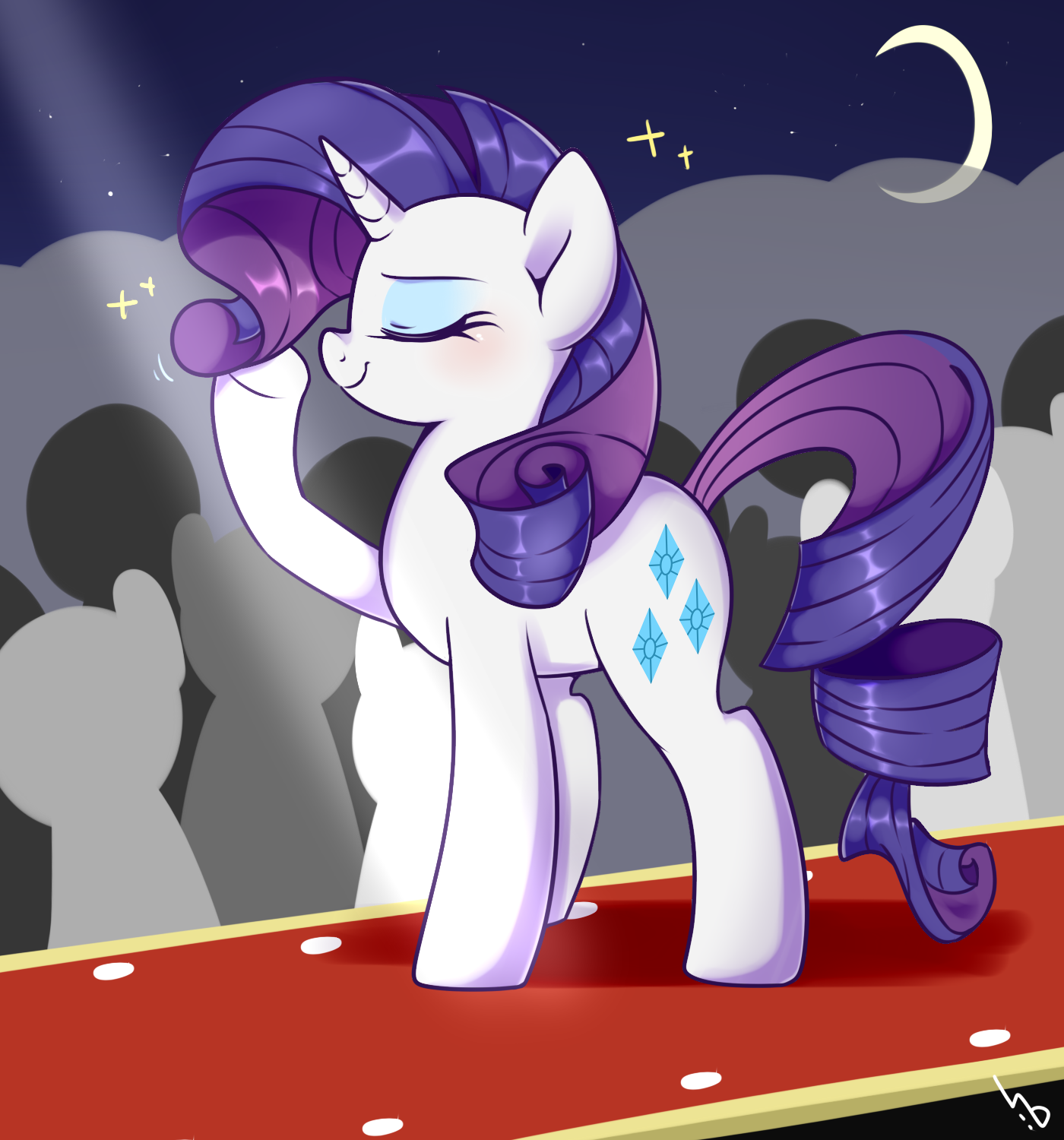 artist:haden-2375, crowd, eyes closed, fabulous, female, mare, pony, rarity, safe, smiling, solo, stars, unicorn, walkway