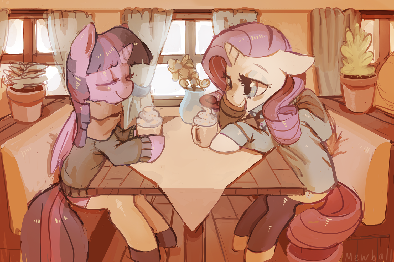 alicorn, artist:mewball, cafe, clothes, duo, female, hot chocolate, mare, pony, rarity, safe, scarf, sitting, twilight sparkle, twilight sparkle (alicorn)
