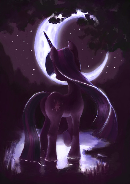 artist:plainoasis, crescent moon, female, mare, moon, night, pony, raised hoof, safe, solo, stars, twilight sparkle, unicorn, water