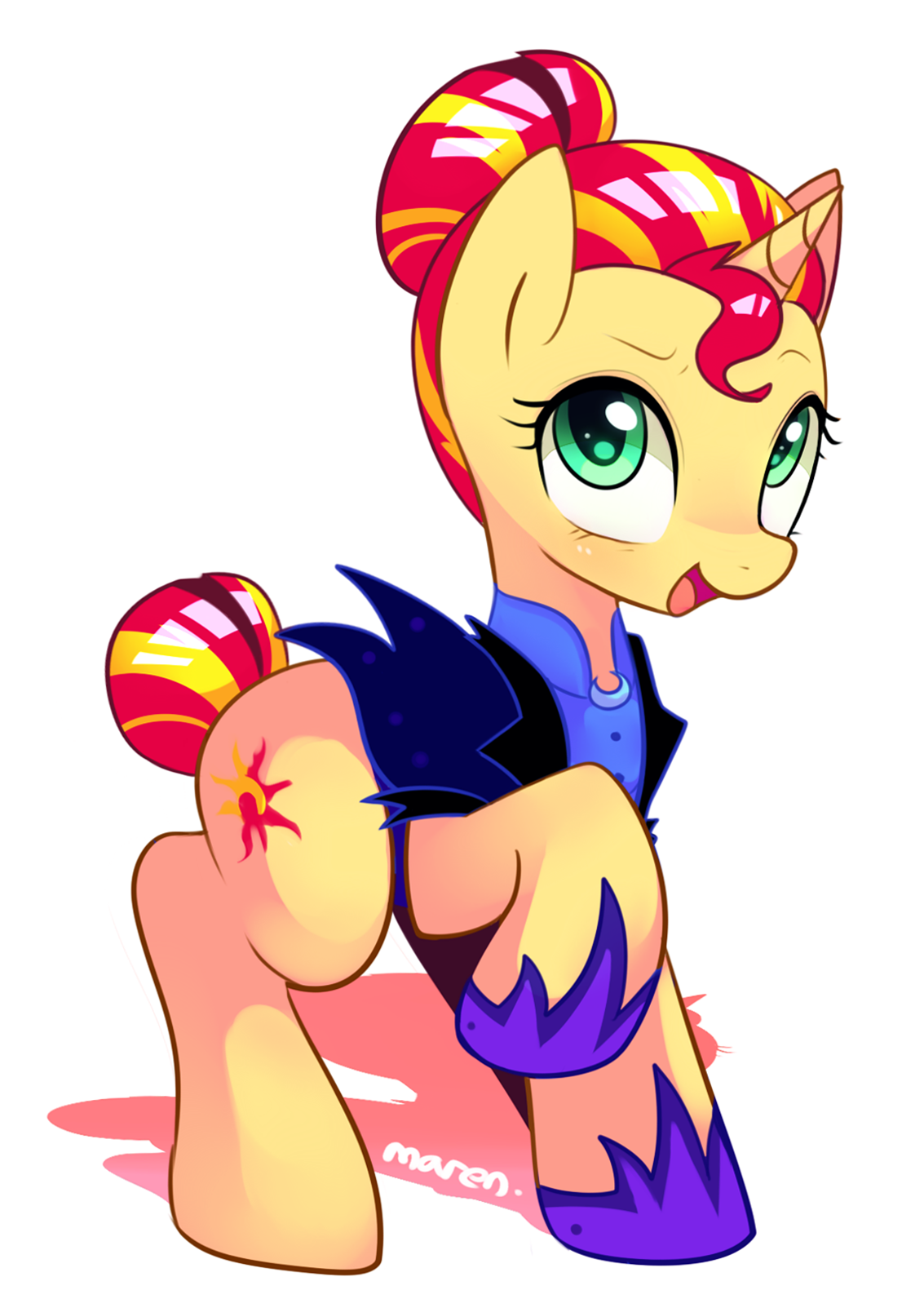 alternate costumes, alternate hairstyle, alternate timeline, artist:maren, backwards cutie mark, night maid rarity, night maid sunset, nightmare takeover timeline, open mouth, pony, raised hoof, safe, simple background, solo, sunset shimmer, unicorn