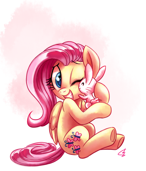 angel bunny, artist:lightof-dawn, cute, duo, eyes closed, female, fluttershy, mare, one eye closed, pegasus, pony, rabbit, safe, shyabetes, signature, sitting, smiling, style emulation, underhoof, whitediamonds-ish