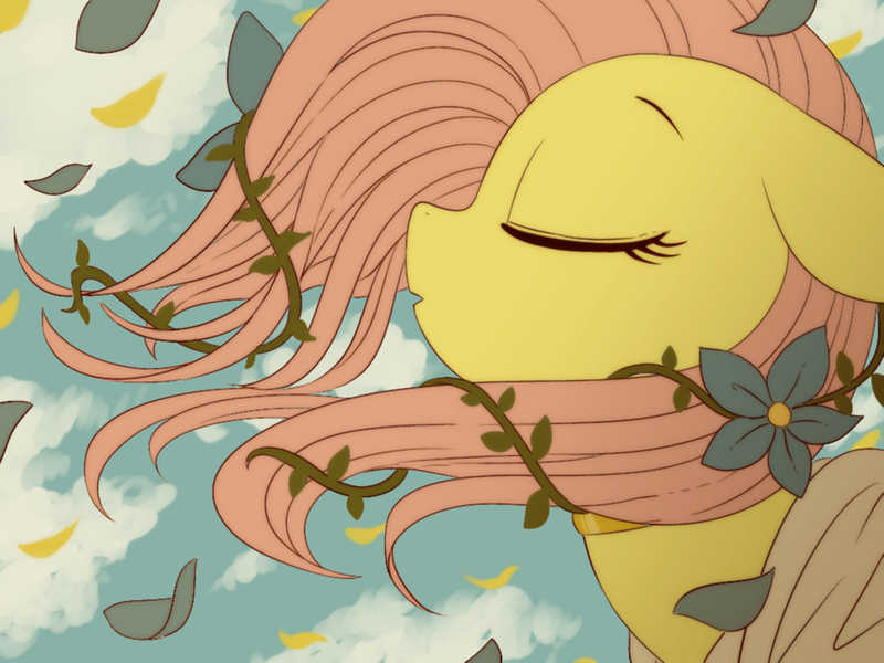 artist:umeguru, cloud, eyes closed, female, flower, fluttershy, leaf, mare, pony, safe, sky, solo, windswept mane
