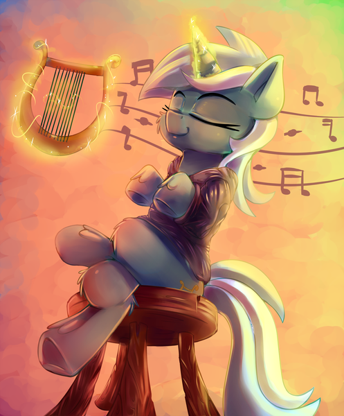 artist:discorded, clothes, crossed legs, eyes closed, fanfic:background pony, female, glowing horn, hoodie, lyra heartstrings, lyre, magic, mare, music, music notes, pony, safe, sitting, sitting lyra, smiling, solo, stool, sweater, telekinesis, underhoof, unicorn, unshorn fetlocks
