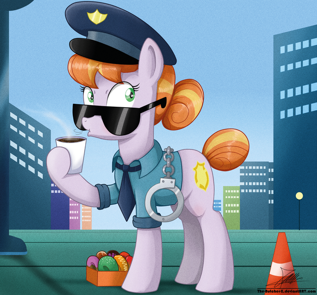 artist:the-butch-x, beverage, blowing, box, city, clothes, coffee, copper top, cuffs, cup, donut, female, food, hot, mare, necktie, police officer, police uniform, pony, safe, signature, solo, sunglasses, the gift of the maud pie, police