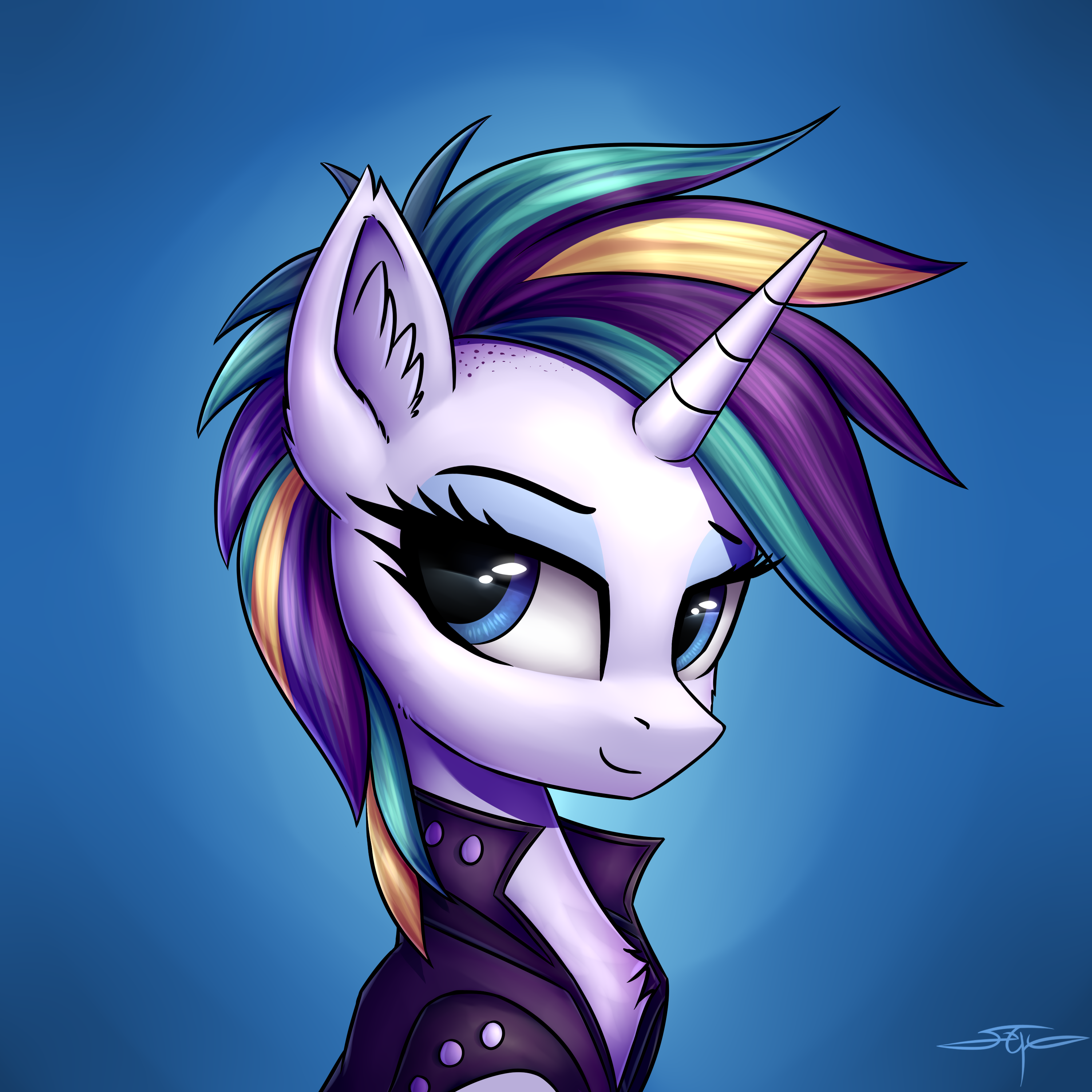 alternate hairstyle, artist:setharu, bust, chest fluff, clothes, cute, ear fluff, eyeshadow, female, it isn't the mane thing about you, lidded eyes, makeup, mare, multicolored hair, pony, portrait, punk, raribetes, raripunk, rarity, safe, signature, smiling, solo, unicorn