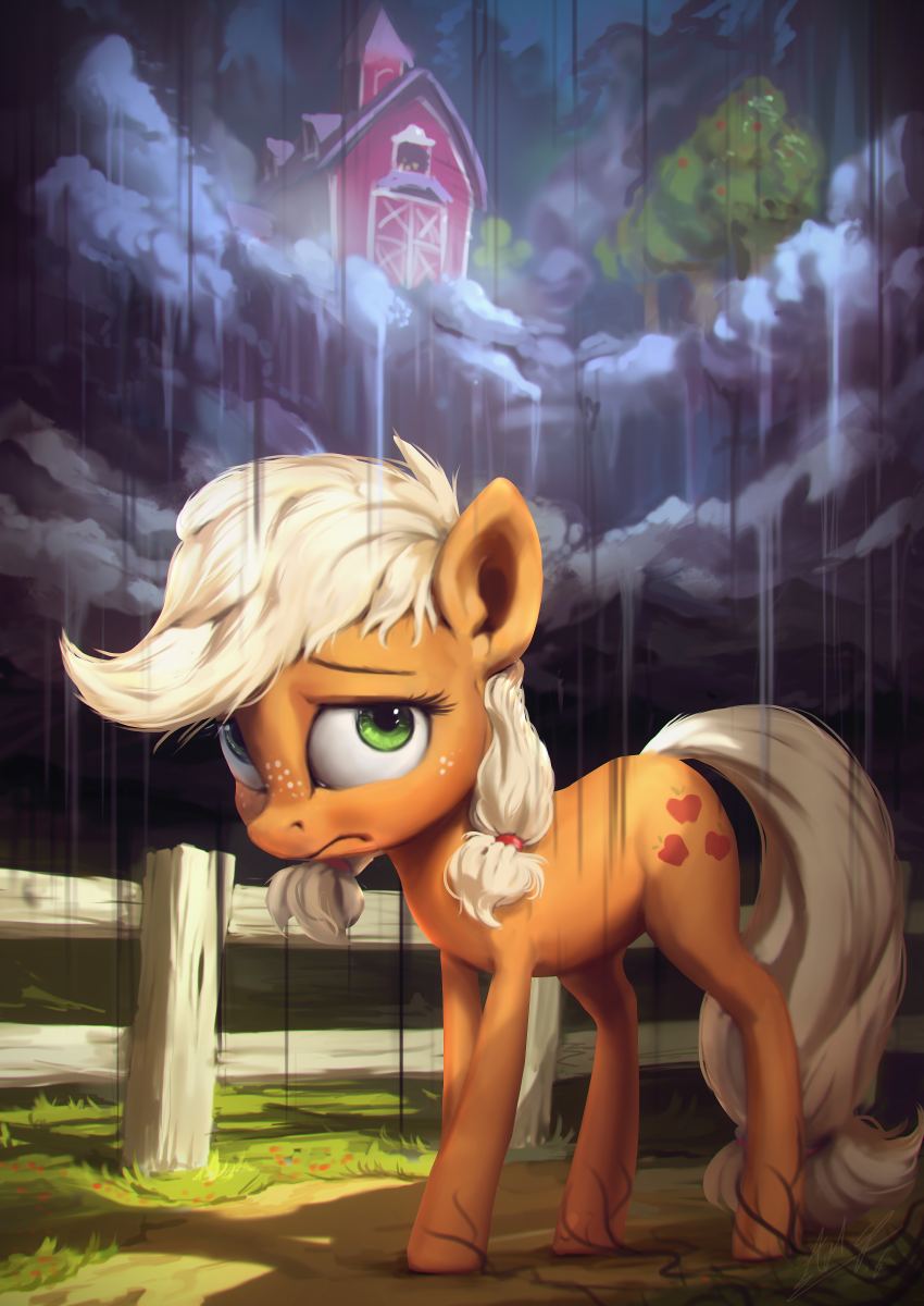 applejack, artist:assasinmonkey, barn, earth pony, female, fence, freckles, pony, rain, sad, safe, solo, sweet apple acres, teenage applejack, tree, where the apple lies, younger