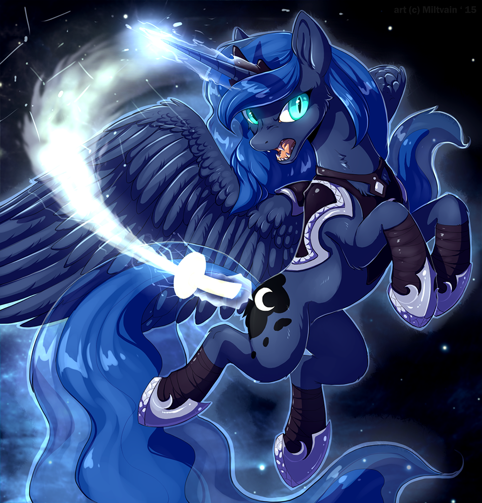 alicorn, artist:hioshiru, fangs, magic, nightmare luna, pony, princess luna, safe, solo, sword, warrior luna, weapon