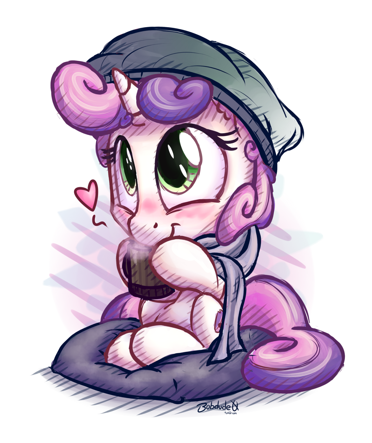 artist:bobdude0, blanket, blushing, cute, diasweetes, drink, drinking, hat, heart, safe, solo, sweetie belle